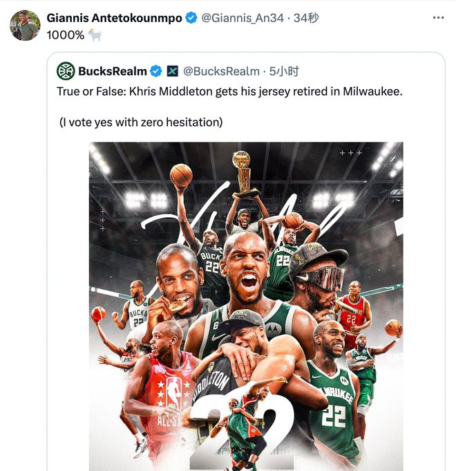 字母哥發推力挺米德爾頓,1000%支持雄鹿為前隊友退役球衣