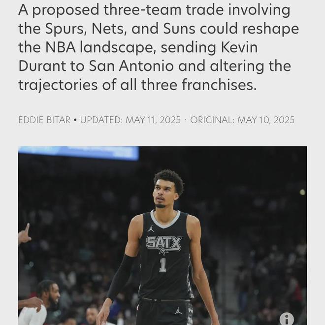 美媒提議馬刺、籃網和太陽的三隊交易,涉及杜蘭特